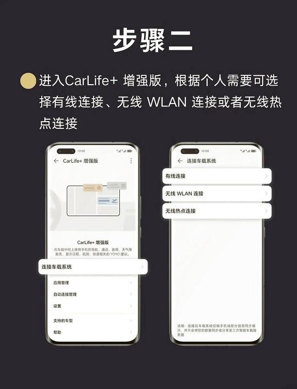 3、在CarLife+增强版中,你可以根据个人需求选择有线、无线WLAN或无线热点连接方式。连接成功后,手机应用便可投屏到车机使用。