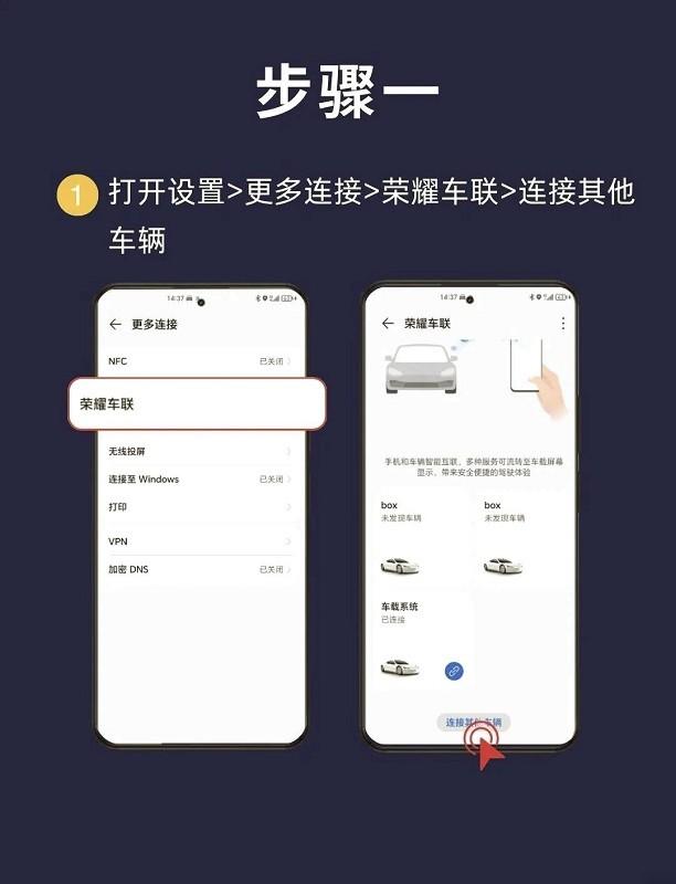 1、打开荣耀手机的“设置”,找到“更多连接”选项,点击进入“荣耀车联”,然后选择“连接其他车辆”。