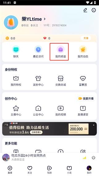 2、然后在我的页面中可以看到有聊天、最近访问、我的频道、我的动态等服务,在这里点击【我的频道】;