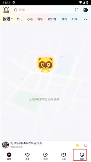 1、首先打开Yy软件,进入到首页中后可以切换到关注、短剧、小说、我的页面,点击右下角的【我的】;