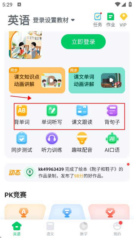 设置完所学教材后,学生们可以在app中对学校课程进行同步学习,巩固每天所学知识点(英语方面可以进行单词口语练习和课文朗读练习等)。