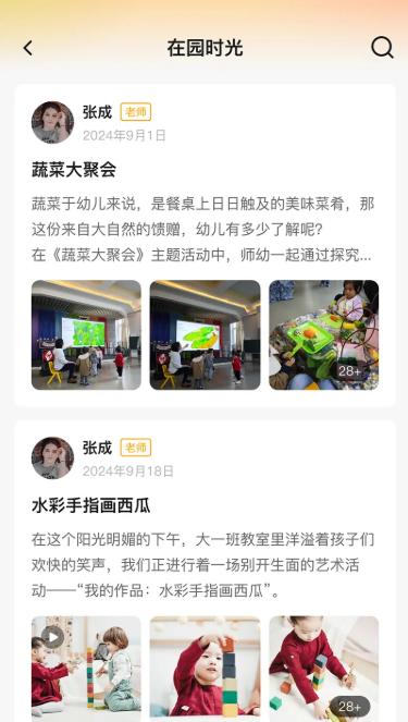 2、查看在园精彩瞬间、活动照片,家庭观察记录,双向内容智能融合。