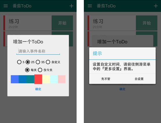 番茄 ToDo 的使用非常方便,点击左上角的加号就能添加番茄钟。你可以选择时间和频率,时间分为5、25、35分钟,如果你觉得预设的时间长度都不适合你,你也可以自定义时间。