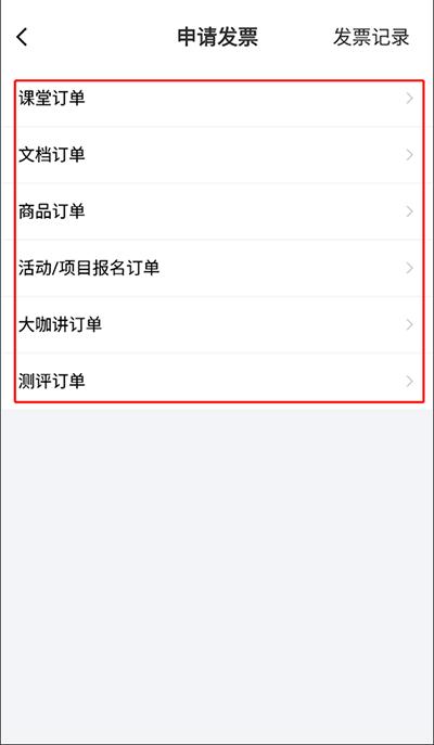 3、在“申请发票”页面中可以对:课堂订单、商品订单、文档订单、活动/项目报名订单以及测评订单进行选择。
