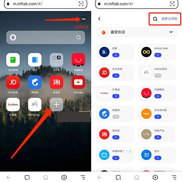 打开狐猴浏览器,就能看到它简洁的UI设计,就是大家很熟悉的 Infinity 标签页,登录Infinity账号,可以同步PC端数据;标签页也支持自定义添加。