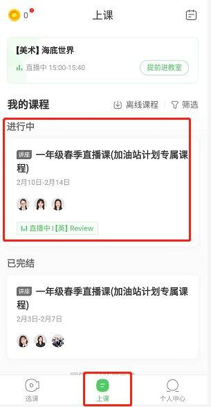 2、点击“上课”,在“进行中”找到已报名课程,点击进入。
