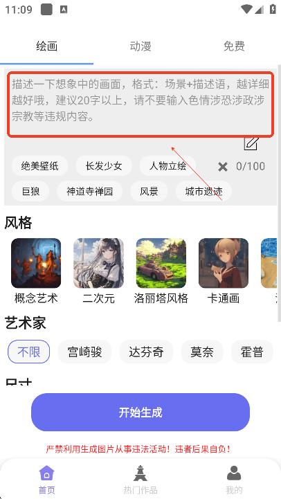 然后选择自己图片的艺术家风格和尺寸,最后点击”开始生成“,就可以得到AI生成的图片啦