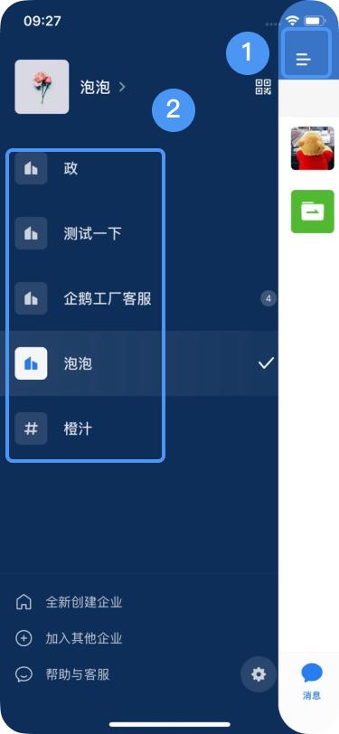 多个企业时,在登录时或者在【手机端->消息页面->左上角“三”】看到多个企业,选择进入对应的企业。