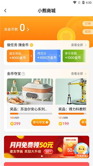 2、在小熊商城中,通过做任务赚取金币,可参与夺宝获得奖品;