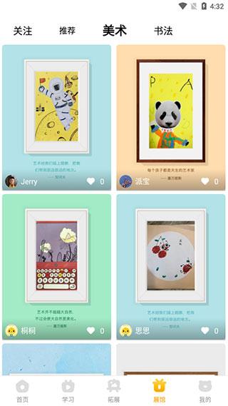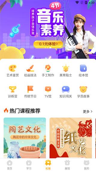 1、下载进入小熊艺术app,在首页中可以看到美术馆、文化手工馆、音乐馆、书法馆课程,用户可以进行学习;