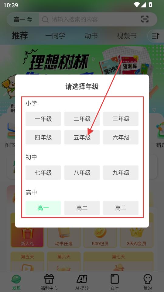 2、进入软件点击上方年级,进入选择界面,根据需求选择即可