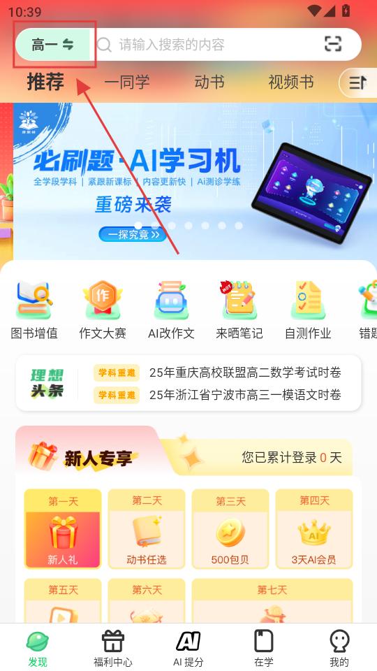 1、首次进入软件可以根据需求选择年级,也可以在软件首页左上角修改