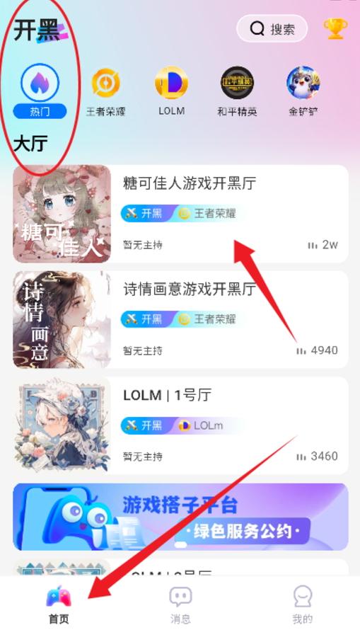 1、进入到软件首页可以看到众多热门的开黑游戏厅,任选一个可以进入;