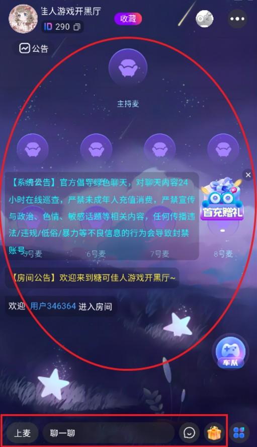 2、在开黑游戏厅中可以上麦,可以发布文字信息,还可以送礼物等;