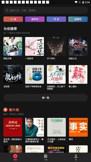 在“探索”页面,用户可以直接搜索书名、作者、音频号去寻找想要的有声读物。除此外,系统也会为用户推荐相关的有声读物,并将一些热门的有声读物加入到“飙升榜”、“热听榜”中,这些榜单也会定期更新。