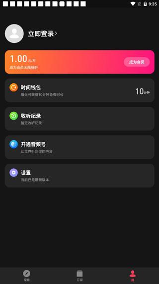 个人中心内主要是基础功能。用户可以查看收听记录,还可以开通音频号,成为创作者。另外可以通过完成“时间钱包”内的任务,进而获得听书时长的奖励,该功能也会记录用户的听书时长和天数。