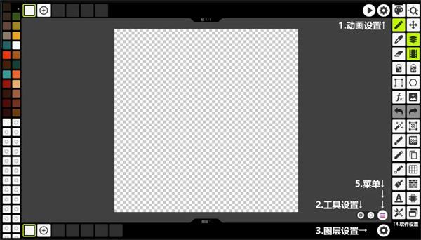 3、如果把图层和动画功能打开,我们会发现有四个设置:动画栏右侧的动画设置、菜单按钮左侧的工具设置、图层栏右侧的图层设置、工具栏最下方的软件设置。记得要到对应的工具设置中寻找想要的功能。比如说我想要删除图层们就要去图层设置中找,我想要调整动画速度,我就要去动画设置里找。