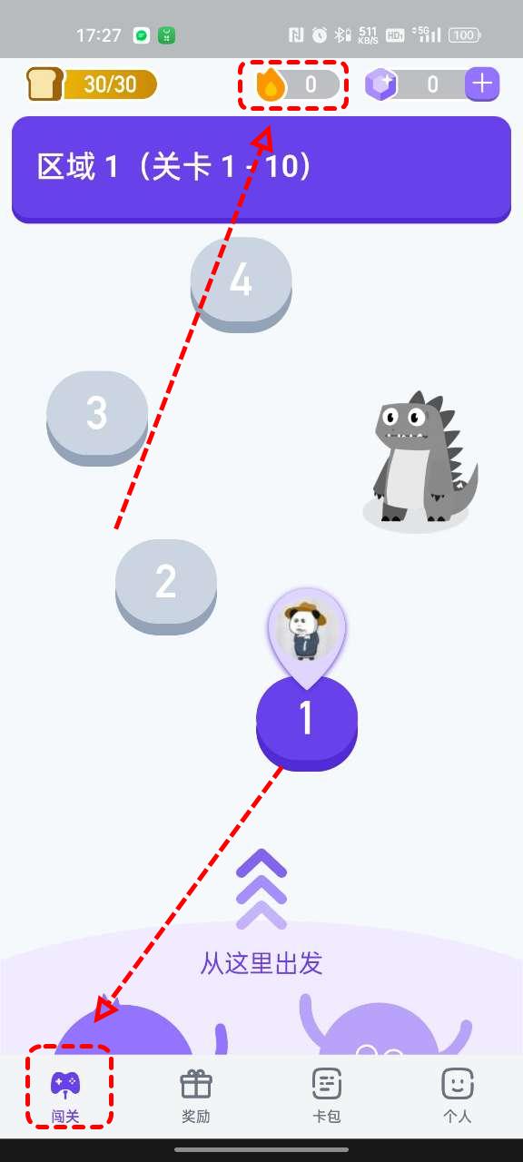 1.首先在本站下载安装本软件并打开进入首页闯关栏目,然后再点击上方的火苗图标