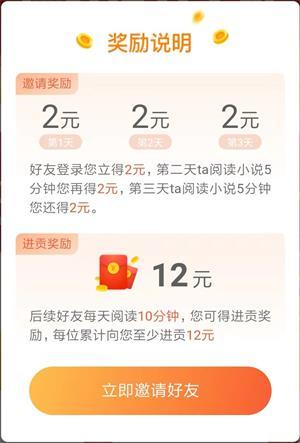 2、邀请好友。由于目前软件有推广活动,用户在邀请好友下载米读书城,并且是首次登录注册,与你形成绑定关系。你可以立即获得2元现金;之后在连续2天阅读小说5分钟,你可以共4元现金奖励;之后好友持续阅读小说10分钟,你可以获得金币奖励,每个好友最多赚取12元。邀请越多赚得越多。