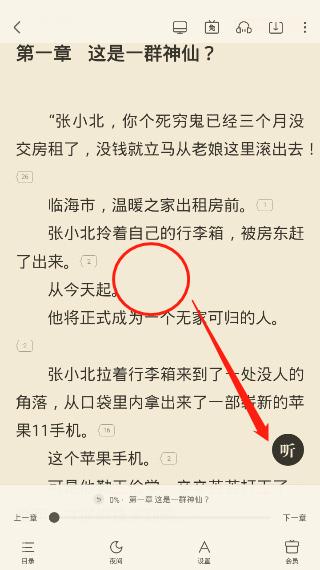 4、在阅读页面点中间的按钮可以呼出菜单。