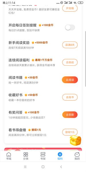 1、每日任务。用户在完成每日任务如:签到、阅读小说、分享书籍等相关任务,都可以获得相对于的金币奖励,利用金币在兑换成现金。兑换金币比例为1000金币=1元现金。