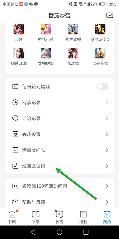 邀请码可任意设置,将此邀请码发给朋友,并让其在他手机里的米读书城app中注册时填写即可。
