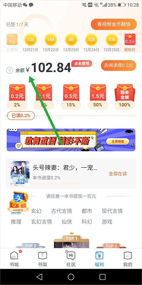 3、其中现金提现还是通过看小说的方式去提现,其中0.3元和1元提现需要阅读小说20分钟,其他的提现需要阅读小说40分钟。每天只能提现一次,提现金额会在1-3个工作日内到账,周六周日会有延迟情况!