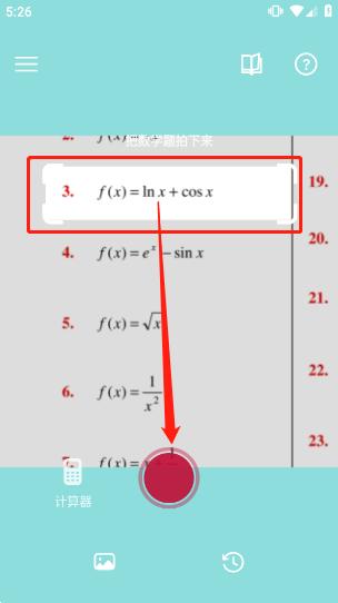 1、进入app我们可通过相机扫描目标题目,快速获得题目文本,下图所示扫描结果即为“f(x)=lnx+cosx”