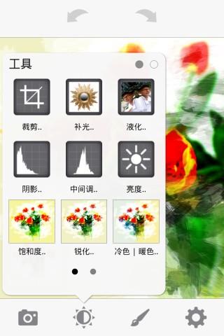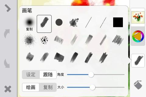 PhotoViva画笔的种类繁多,有线状、粉状、蜡笔状、油笔状等一共 20 种画笔,笔触的效果一目了然。下方四个按钮作用如下: