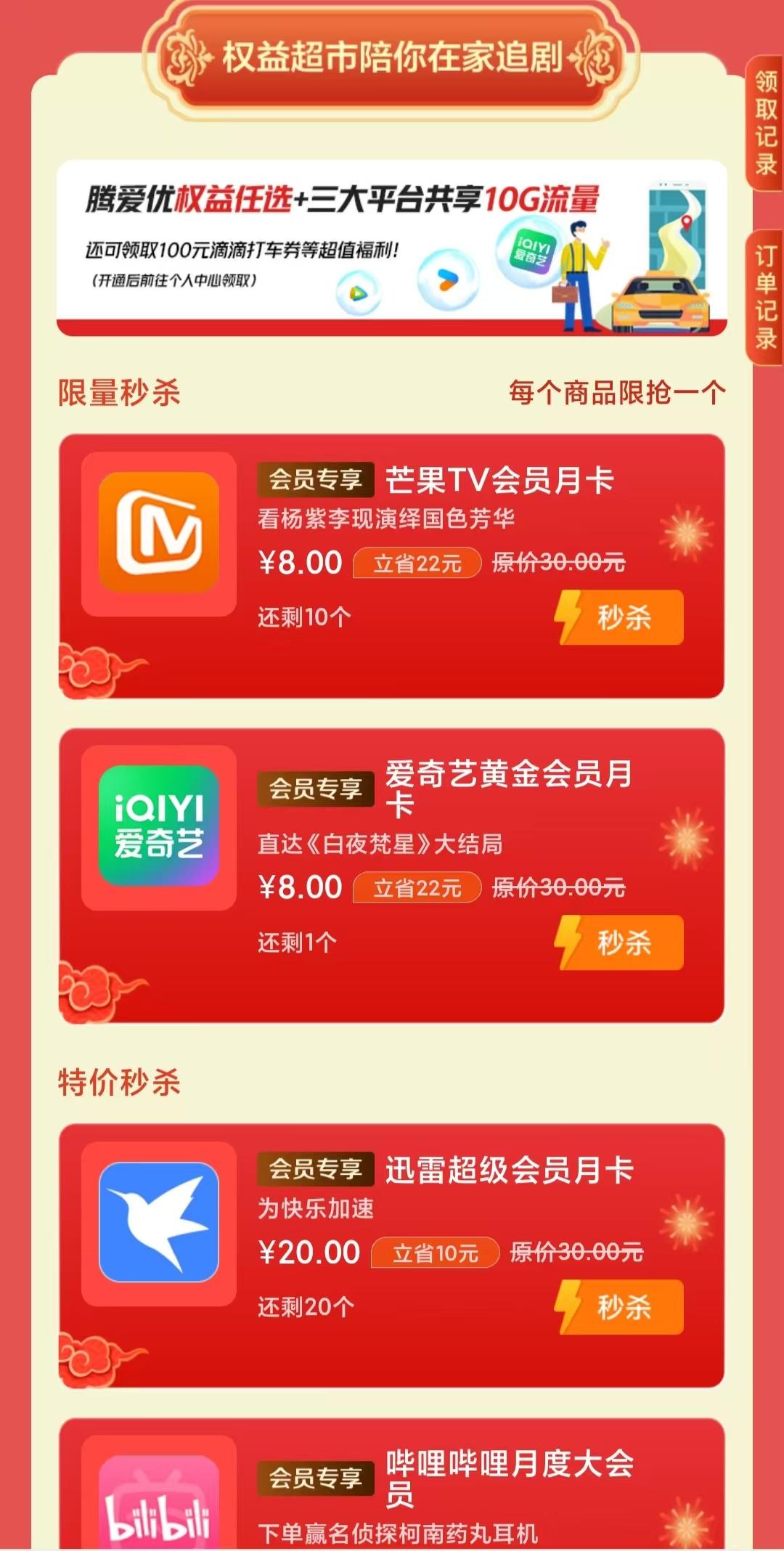 还有个新春主题活动,包括超低价视频会员秒杀、吃喝玩乐会员免费领的活动,抢这些会员还是能省不少的,推荐参与。