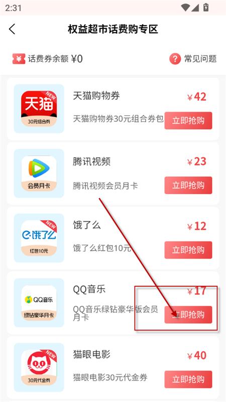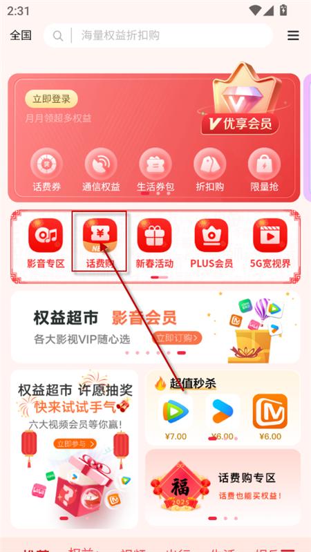 1、在本页面下载并打开中国联通权益超市app,用手机号登录之后,点击首页话费购专区;