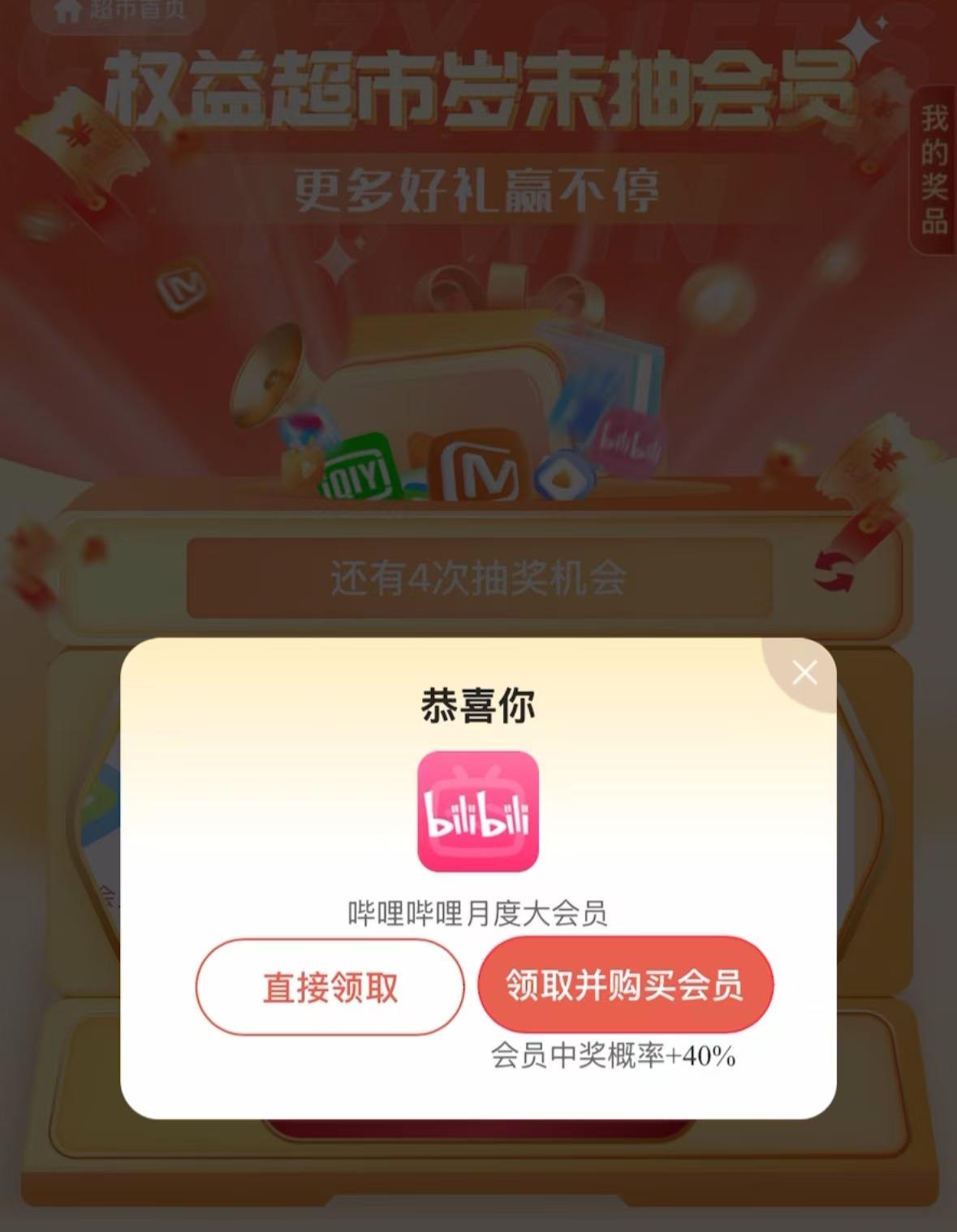 先参加一个免费抽奖,有两次机会,还可以参加任务赢取更多免费抽奖机会。奖品包括优酷、爱奇艺、B站、芒果TV、腾讯vip月卡、话费券、权益超市抵扣券等。抽奖活动截至3月31日,免费的不抽白不抽。