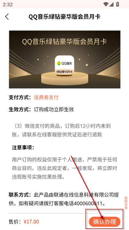 3、在弹出的页面下方点击确认办理,就会扣除相应话费获取对应的权益了。
