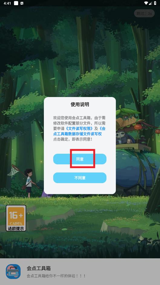 打开会点工具箱app,点击同意使用说明