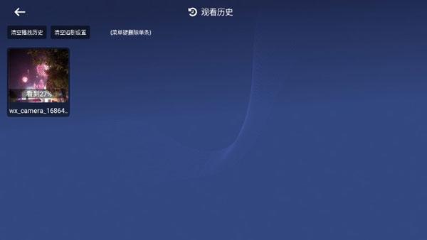 在文件管理界面,焦点移动到最左侧,再往(观看历史)方向移动,进入播放历史界面;在播放历史界面,用菜单键删除单条记录;