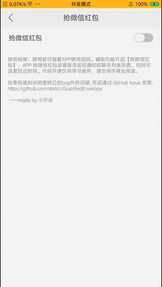 辅助功能开启【抢微信红包】,若使用默认参数则通知或聊天列表页面或群聊发现有红包,则会自动点击红包并拆开跳转到详情页自动关闭。