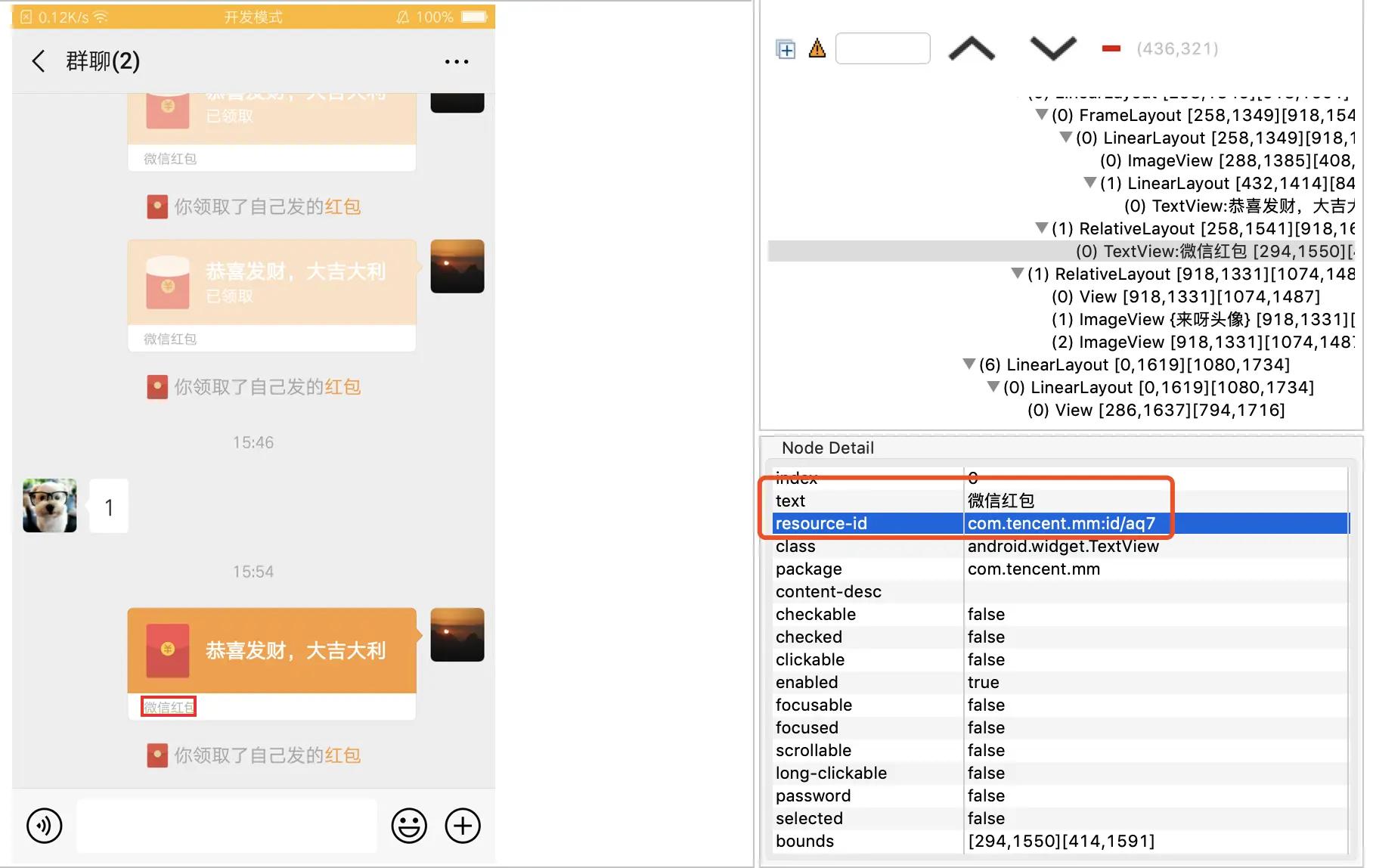 手机发个红包然后查看视图如下,我们可以找到id和text: