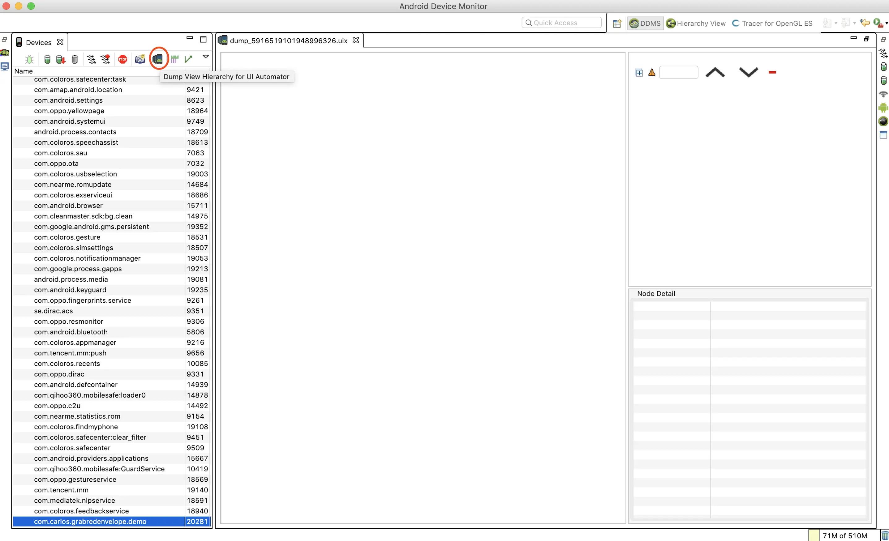 手机连接上后选中要看当前页面视图的进程名,如下图选中的当前测试的APP,点击圈中的图标中间就会显示当前顶层Activity视图如下: