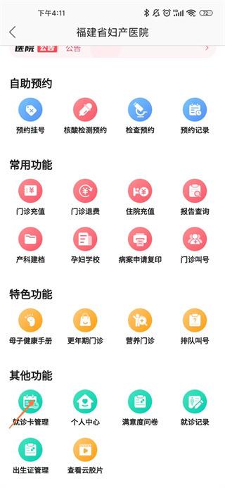 1、打开福建省妇幼公众版APP进入首页,选择要就医的院区,接着点击“就诊卡管理”。
