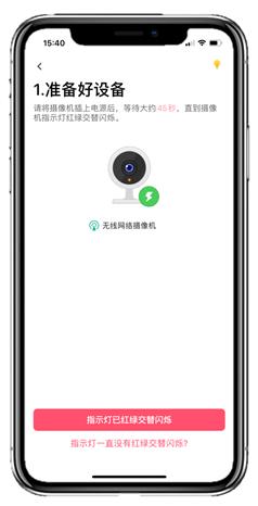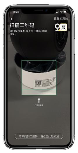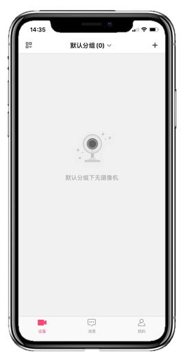 1. 登录APP后,摄像机在出厂状态下上电后红绿灯交替闪烁,在APP上点击 设备 主界面右上角的“+”,扫描无线网络摄像机机身上的二维码,如下图: