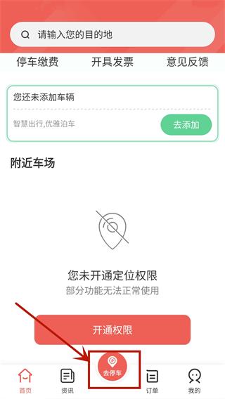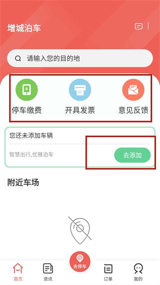 2、在首页可以查看停车缴费、开局发票,还可以一键添加自己的车辆信息。