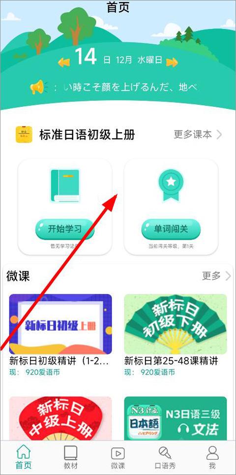 1、打开日语吧app,进入首页,用户可以选择标准日语教材进行学习和单词闯关,同时首页也有简单的日语课程可以学习;