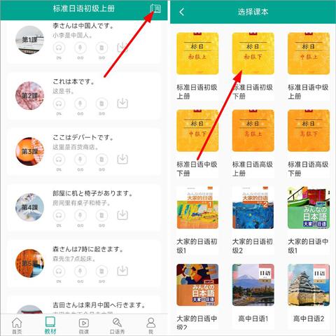 2、教材页面中,点击右上角课本标志可以选择学习日语的课本;