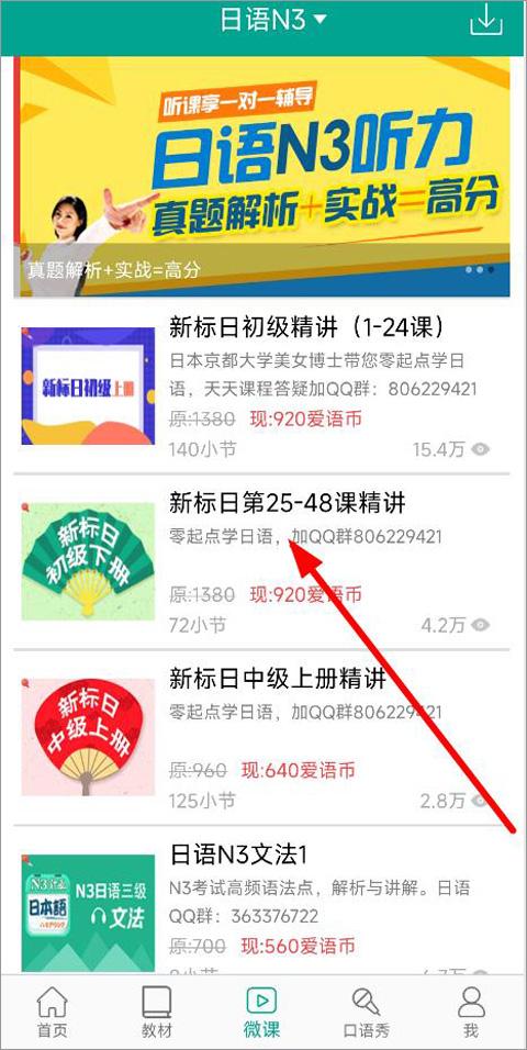 3、微课页面中有新标初级日语精讲、新标日语中级精讲等课程,用户可自行选择学习内容;