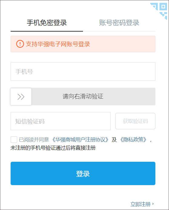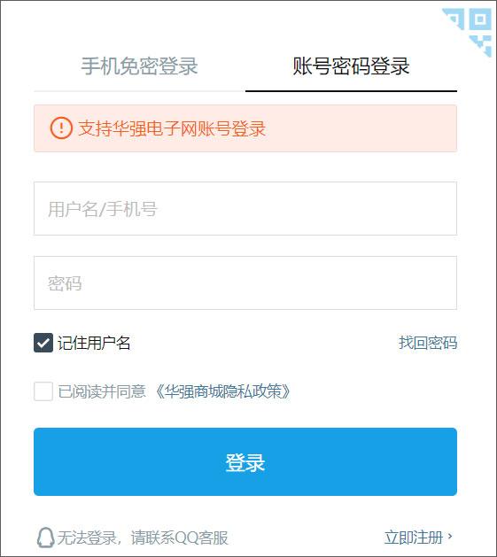 3、点击右上角“二维码”,微信扫描二维码关注“华强商城”登录。