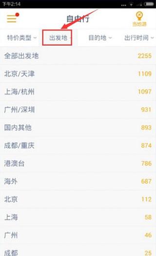 3、点击出发地,即可了解所有选择出发地的特价信息,用户可以根据自己选择的出发地来选择旅游线路哦。