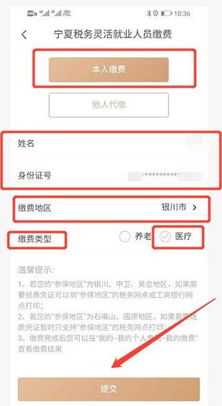 6、【本人缴费】,系统会自动识别【姓名】【身份证号】。我们需要选择【缴费地区】,例如【银川市】。选择【缴费类型】:【医疗】。点击【提交】可进行缴费