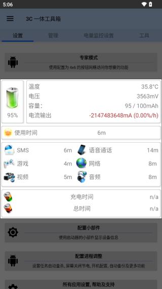 1、进入3C 一体工具箱,我们可以看到“设置、管理、电量、工具”四大板块,每个板块下都是具有很多功能的;
