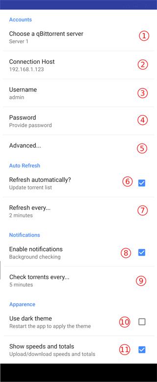 3、要开始使用该应用,你必须通过从左侧菜单中选择“设置”来设置qBittorrent服务器的设置和帐户