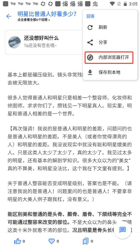 2、登录时如果遇到问题,可以先点进一篇文章,然后点击右上方的三个点,然后再点击【内部浏览器】打开;